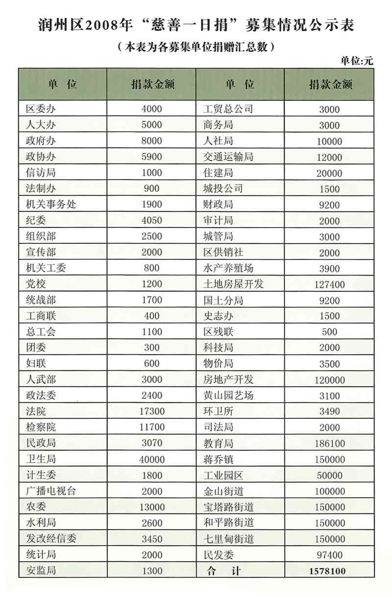 上一篇:润州区2007年“慈善一日捐”募集情况公示表 下一篇:润州区2009年“慈善一日捐”募集情况公示表