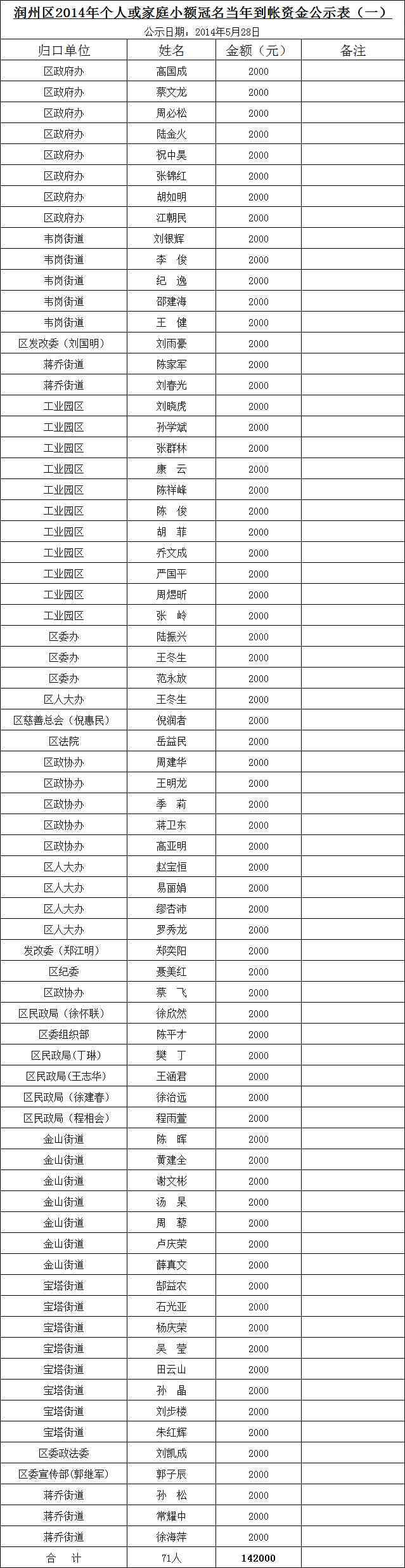上一篇:润州区2014年“慈善一日捐”公示表 下一篇:润州区2014年个人或家庭小额冠名当年到帐资金公示表(二)