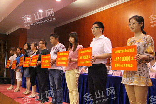 仪式上市慈善总会会长周大平向润州慈善书画院颁发牌匾,由该院书画家志愿者们向突出贡献的慈善企业家们赠送了一批书法善联作品。同时,参加个人或家庭小额冠名的37名爱心人士代表在现场举行捐赠仪式,将一笔笔爱心善款送到了受助的7名孤儿和33户贫困对象手中。据了解,全区148名爱心人士参加小额冠名签约共148万元,定向用于慈善救助。