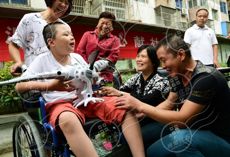 工作人员向残疾小朋友小宇赠送代步轮椅