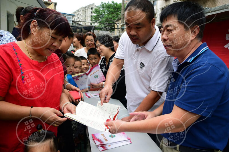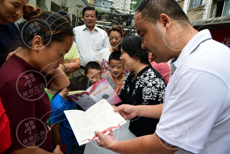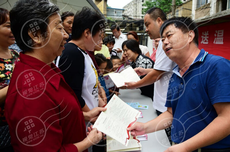 2017年8月31日,慈善部门工作人员在向居民宣传《中华人民共和国慈善法》。当日,在《中华人民共和国慈善法》施行一周年之际,江苏省镇江市润州区慈善总会、金山街道慈善分会和红光社区慈善工作站联动,开展“《慈善法》宣传进社区”活动,向广大居民宣传以法促善、依法行善的相关知识。