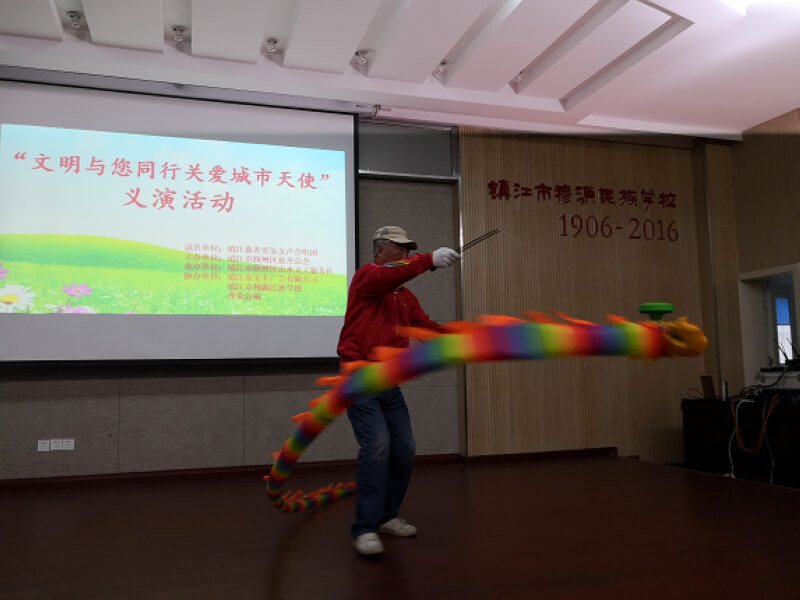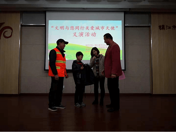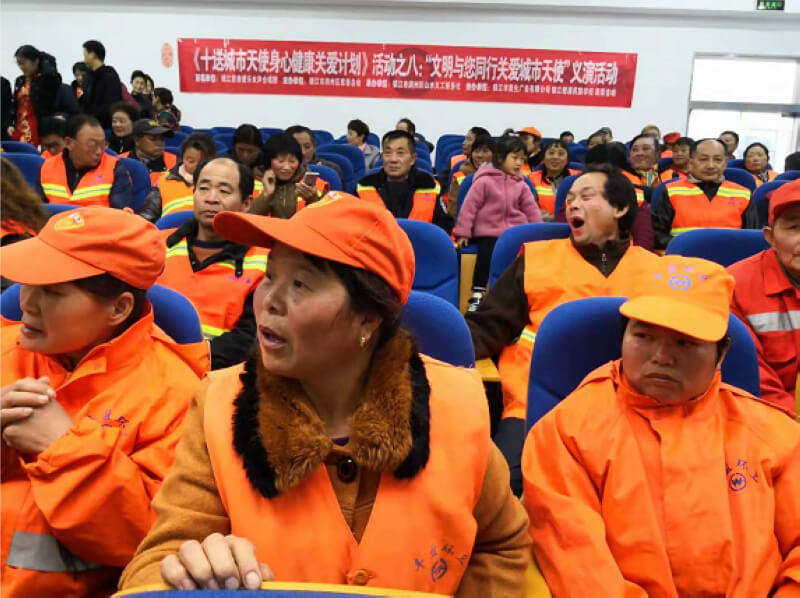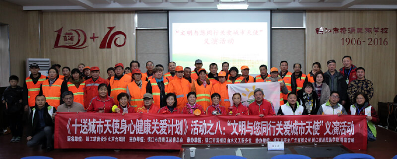 活动随着开场舞《中国脊梁》拉开了帷幕,志愿者的吹、拉、弹、唱,环卫工人展示的抖嗡绝活,为环卫职工带来一份精神大餐。环卫职工是净化、美化城市的“美容师”,他们常年在最苦、最累、最脏的环卫工作岗位上默默地付出,收入低,不被人们所重视。为了能更好地关爱这群“城市天使”,润州区慈善总会协同镇江市润州区山水义工服务社从今年六月份开始开展了“关爱城市天使项目‘十送’系列活动”,至今,已经先后开展了送免费体检、送清凉、送团圆礼包、送电影、送旅游、送美丽影相等七项活动,通过活动中的物质、精神和行动上的帮助,努力提升环卫职工的社会地位和生活品质,同时让他们真切地感受到社会大家庭的温暖,也希望通过志愿者的身体力行,传播慈善文化,让更多的社会爱心人士参与其中,用善行温暖整个社会。