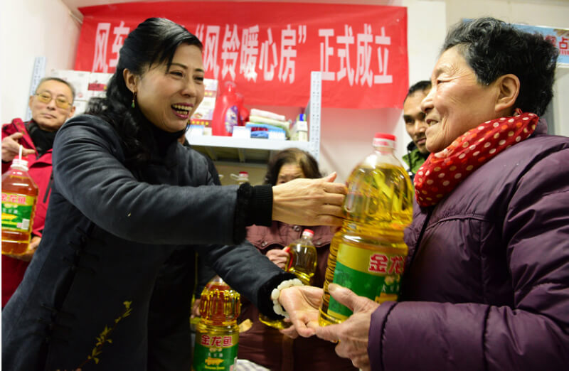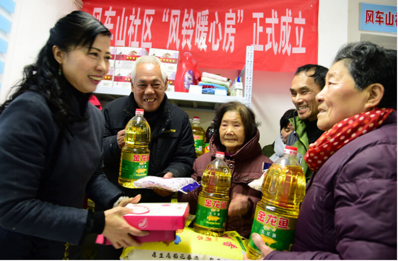 2019年1月9日,江苏省镇江市润州区金山街道风车山社区慈善工作站“风铃暖心房”成立,由区人大代表捐资购买的米、油等生活日用品,将定期用于帮扶社区的困难家庭和三无老人,为他们送上暖心关怀。