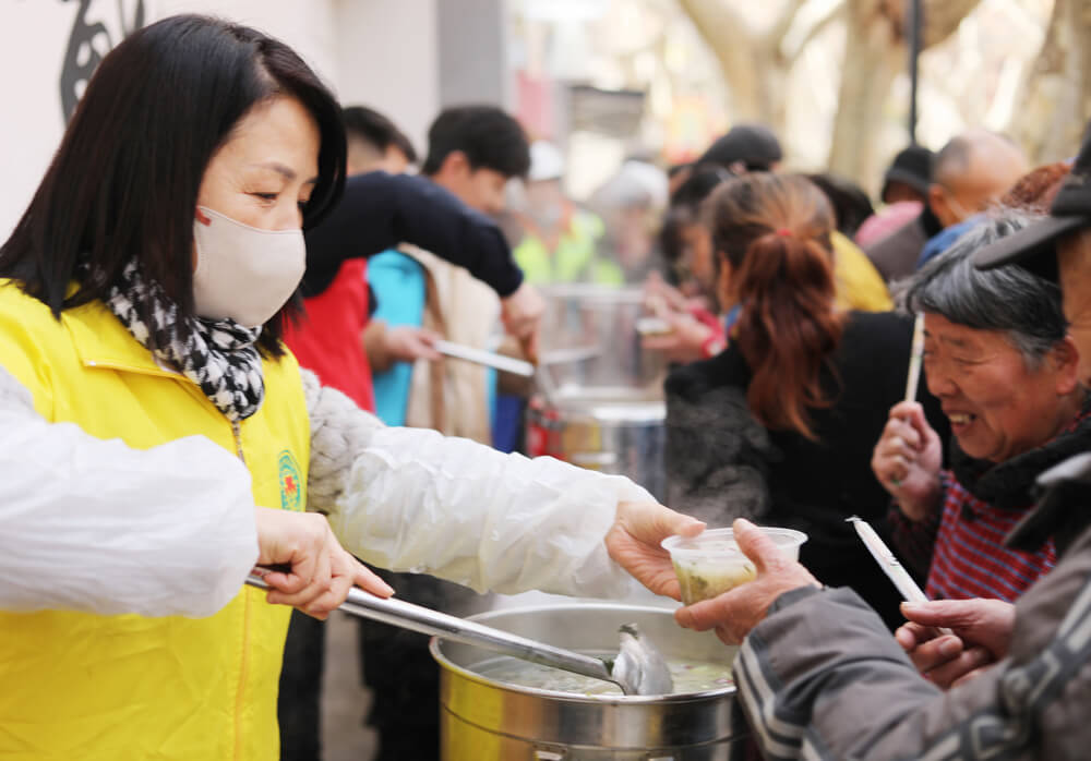1月7日,农历腊月初八,由润州区慈善总会、润州区金山街道京畿路社区以及润州区同创社会工作服务中心联合举办的“浓情腊八粥 温暖众人心”活动在京畿路上的网红打卡点举行。当日,活动主办方还在街道善院慈善助餐食堂设点,为辖区居民、环卫以及市政工人赠送腊八粥,并由志愿者为辖区16户独居孤寡老人送粥上门。